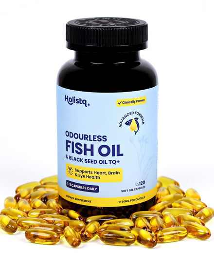 Everyday Omega Support, Elevated with Black Seed Nutrition. Holistq Odourless Fish Oil & Black Seed Oil TQ+ brings together two time-honoured wellness oils in one easy, odourless capsule. This thoughtfully balanced formula combines high-quality fish oil with standardised black seed oil, delivering essential fatty acids alongside naturally occurring thymoquinone (TQ)